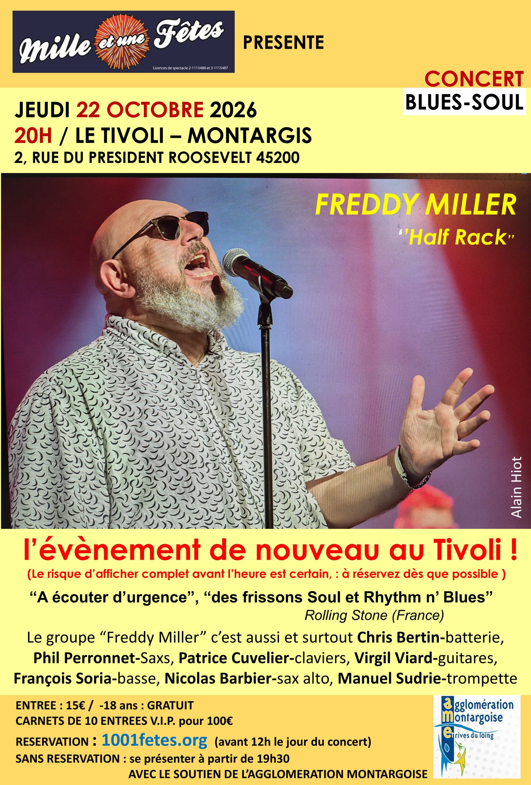 Salle du Tivoli 2 Rue Franklin Roosevelt, MONTARGIS, LOIRET, FranceLIEN POUR LA RÉSERVATION “Freddy Miller c’est plus qu’un concert, c’est un show teinté de Blues, de Soul et de Rhythm and Blues !” Ce gros succès repose, évidemment sur le talent des musiciens mais aussi sur les compositions du groupe, un remarquable travail collectif sous la plume de Freddy Miller, avec en prime quelques...