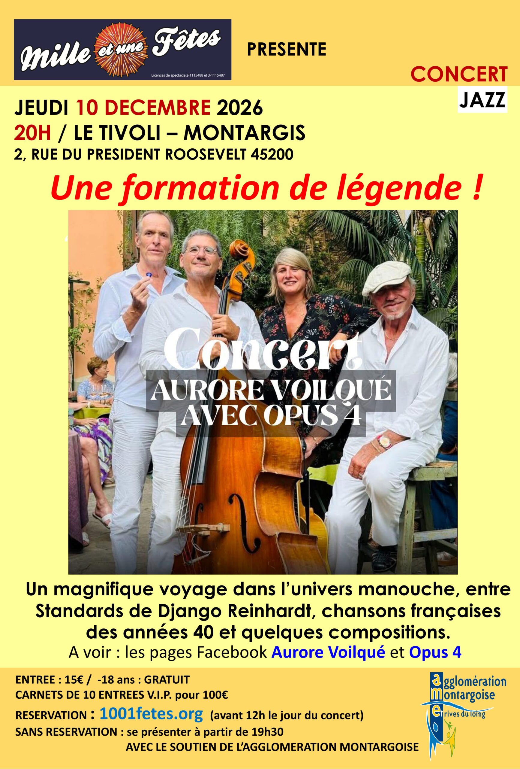 Salle du Tivoli 2 Rue Franklin Roosevelt, MONTARGIS, LOIRET, FranceLIEN POUR LA RÉSERVATION AURORE VOILQUE + OPUS 4 : UNE FORMATION DE LEGENDE ! Un grand concert se prépare, l’extraordinaire violoniste AURORE VOILQUE, qui était venue à Montargis une fois avec Rhoda Scott et une autre fois avec Angelo Debarre, et qui accompagne souvent Jacques et Thomas Dutronc, sera accompagnée par « Opus 4 » Réservation avec paiement...