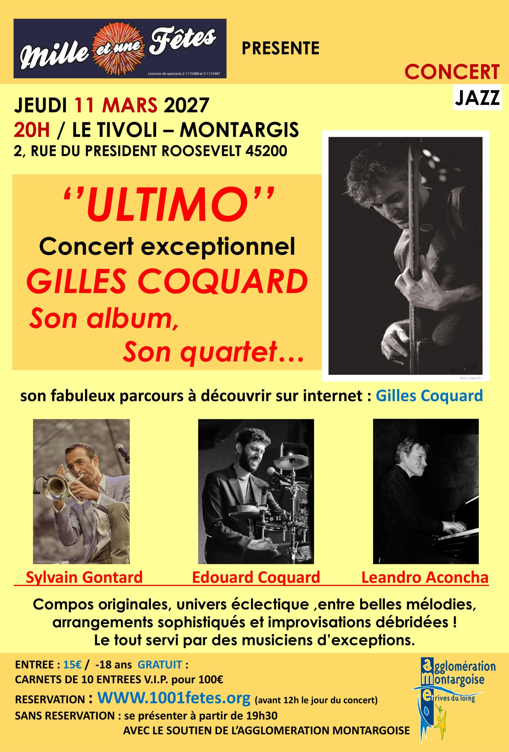 Salle du Tivoli 2 Rue Franklin Roosevelt, MONTARGIS, LOIRET, FranceLIEN POUR LA RÉSERVATION Gilles Coquard présente sur scène son nouvel album : « ULTIMO » « Gilles a confié la réalisation de cet album à son fils Édouard, qui lui a suggéré de jouer d’un maximum d’instruments : de la basse bien sur, de la contrebasse, du piano, du Shahi Baaja ( sorte d’épinette...